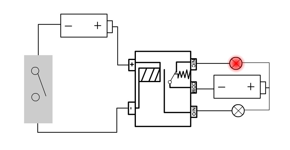 這個(gè)交互式動(dòng)畫(huà)向您展示了一個(gè)非常簡(jiǎn)單的場(chǎng)景,其中使用了N / O和N / C,根據(jù)是否有通過(guò)繼電器的電源,打開(kāi)紅色或綠色光源。